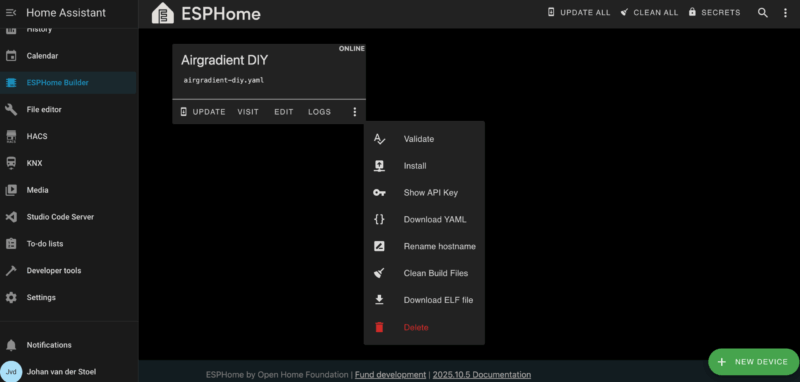 Als je een compleet geassembleerde Airgradient sensor koopt, is de software al op de ESP geladen en getest. Je zou deze dan moeten kunnen koppelen met de Airgradient koppeling in Home Assistant. Dit heb ik verder niet getest. Ik ben er later achtergekomen dat je op de DIY versie ook de Airgradient software kunt installeren. Deze is beschikbaar op GitHub. De route die ik heb gekozen is die via de ESPhome integratie. Zie esphome.io voor een complete beschrijving. Het idee van ESPhome is om op een hele makkelijke manier allerlei sensoren aan allerlei microcontrollers te kunnen koppelen om deze op afstand uit te kunnen lezen en bedienen. Dit platform ondersteunt vele microcontrollers en honderden sensoren. Het is primair geschreven om te gebruiken om devices draadloos te koppelen met Home Assistant, maar er zijn ook integraties met andere platformen beschikbaar. Firmware kun je draadloos (Over The Air) updaten en er is uitgebreide logging beschikbaar (in Home Assistant) waarmee je kunt zien of je sensor goed gekoppeld is aan je microcontroller en goed werkt. Het enige programma dat je moet schrijven voor de microcontroller is een YAML configuratie bestand.