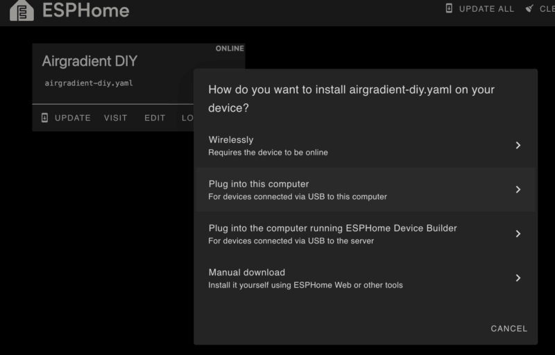Klik vervolgens op de manier waarop je de eerste keer je programma wilt installeren. Mijn advies is om je device via USB-C te koppelen aan je laptop. Wat je nu ziet is fascinerend: ESPHome Builder gaat nu de firmware genereren voor de microcontroller. Dit gaat waarschijnlijk niet zo snel omdat dit compileren plaatsvindt op je HA server. En dan ben je blij met een Intel server in plaats van een Raspberry Pi 😉 Zodra de firmware gereed is, moet je deze downloaden en kun je deze via de wizard uploaden naar je device. Als dit ook afgerond is, zal het device opnieuw opstarten en kun je in de logs zien of alles goed gaat. Je kunt nu de USB-kabel loshalen en het apparaat nogmaals op laten starten. Bekijk de logs en als dit ook goed gaat, kun je verder met het aanpassen van je YAML file. Ik ben erachter gekomen dat je de YAML scripten ook kunt downloaden van Github. Deze zijn erop gezet door gebruiker MallocArray en bevatten enkele leuke extra features. Link: https://github.com/MallocArray/airgradient_esphome/tree/main